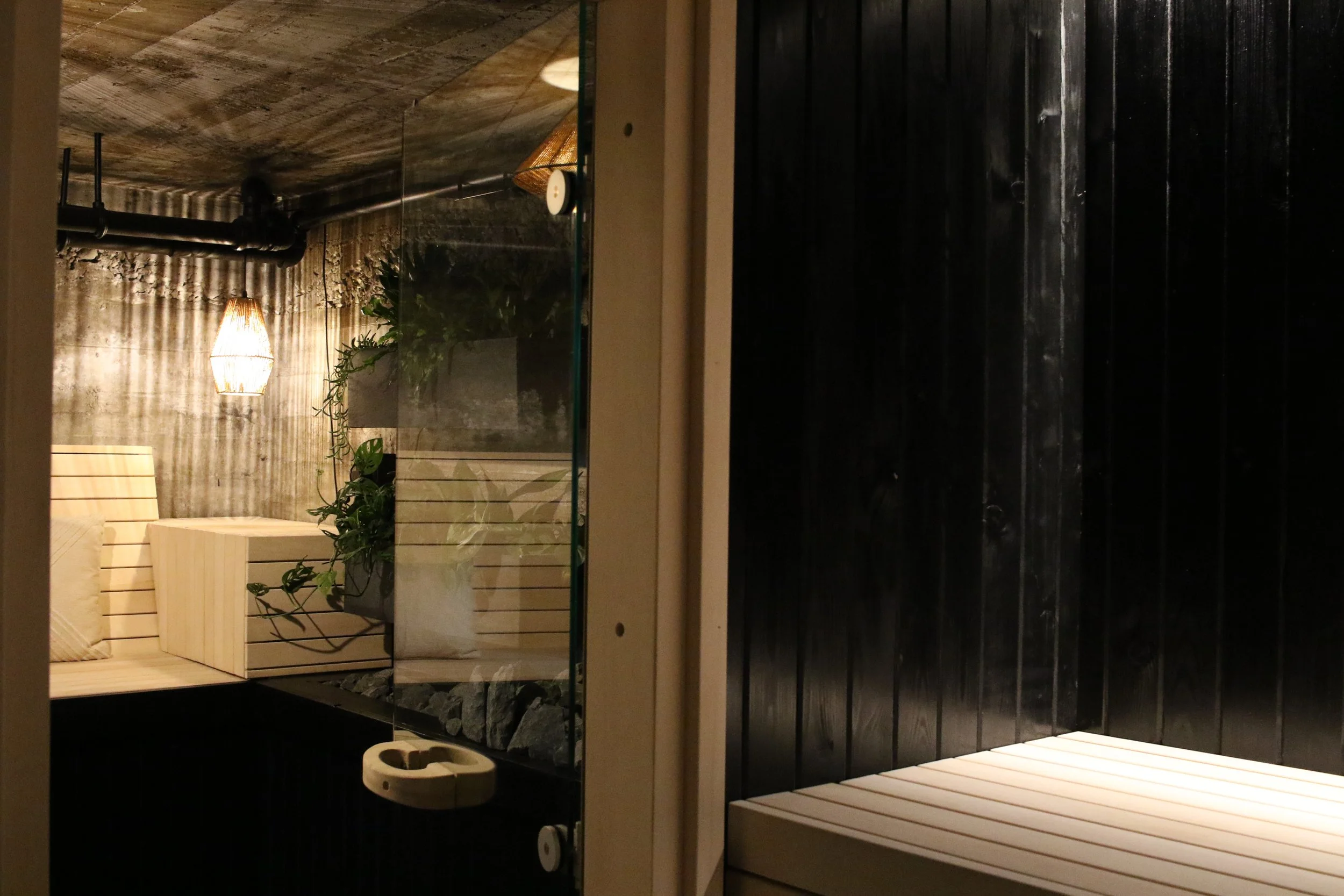 Dirt cellar converted into spa-experience sauna featuring black wax cedar walls, basswood benches, custom changing room with a slate water feature, live plant wall and warm lighting.
